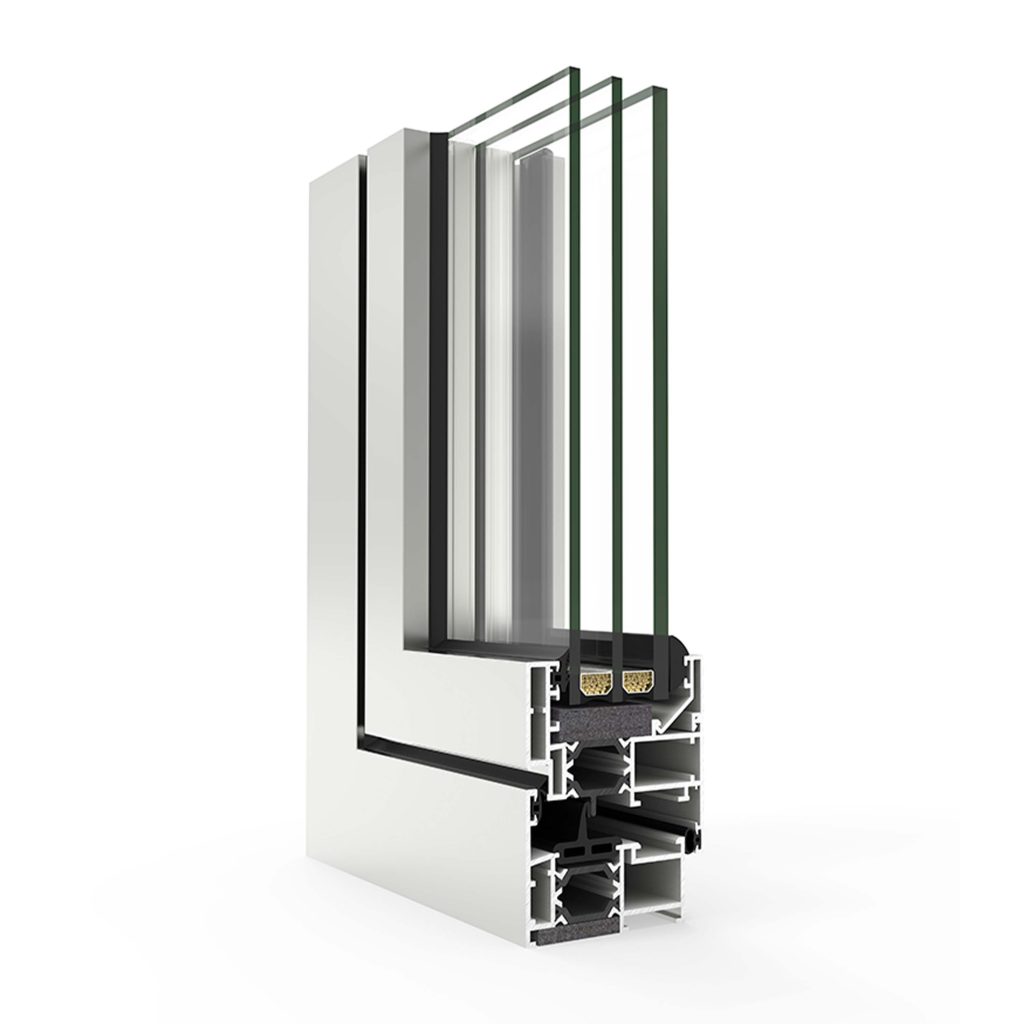 Sistem cu deschidere batantă, cu adâncime a tocului de 60 mm, echipat cu bare din poliamidă de 24 mm, care oferă un confort termic și acustic ridicat, atingând o atenuare a zgomotului de până la 48 dB.